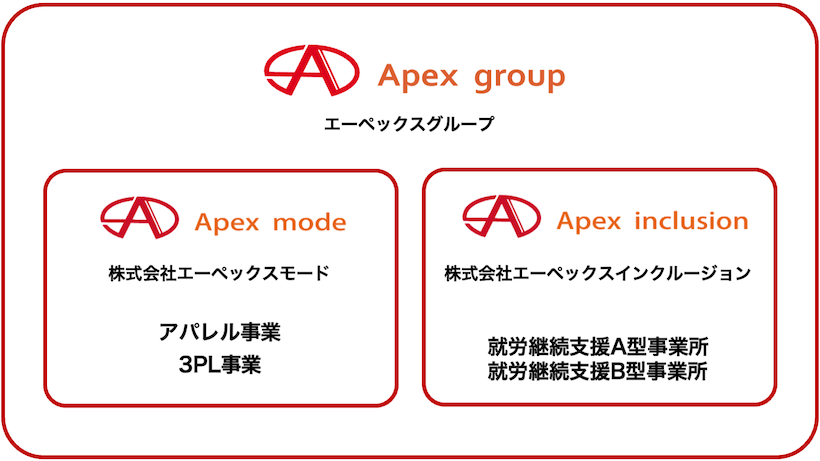 エーペックスグループは、アパレル事業・3PL事業の株式会社エーペックスモードと、就労継続支援A型とB型事業所の